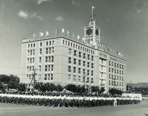 1959年新中國成立10周年大慶時,北京郵電學院游行方隊經(jīng)過電報大樓。