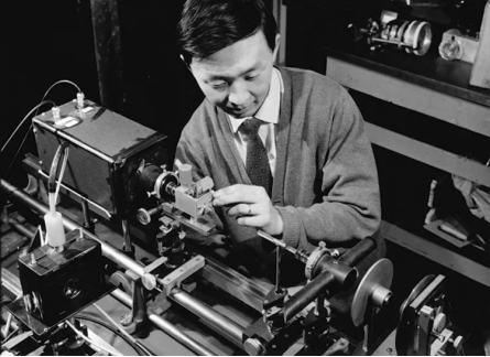 高錕在英國(guó)的標(biāo)準(zhǔn)電信實(shí)驗(yàn)室測(cè)量熔融石英的透明度(圖片來(lái)自中國(guó)電信博物館)