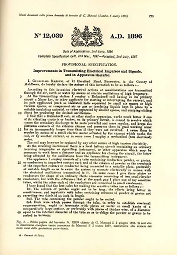 和波波夫不同的是,馬可尼雖然也沒有得到本國政府支持,但在母親鼓勵下,他前往英國倫敦發(fā)展。1896年6月2日,就在俄國的波波夫發(fā)出全世界第一封有明確內容的無線電報之后3個月后,馬可尼如愿申請到自己的無線電專利,當時名為“發(fā)射電脈沖和信號及其設備的改進”,專利號碼為12039/96,這也是世界上第一個無線電報系統(tǒng)專利。