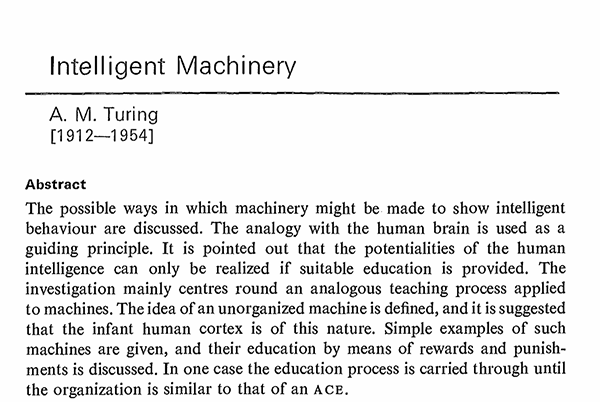 其實早在1948年,圖靈就完成了一篇題為《智能機(jī)器》(Intelligent Machinery)的論文,描繪了人工智能中聯(lián)結(jié)主義的大部分內(nèi)容。包括具有學(xué)習(xí)能力的遺傳算法和神經(jīng)網(wǎng)絡(luò)(他稱之為 “無組織機(jī)器”),甚至強(qiáng)化學(xué)習(xí)的思想。這篇具有遠(yuǎn)見卓識的論文是關(guān)于人工智能的第一個宣言,但遺憾的是圖靈從未發(fā)表它。