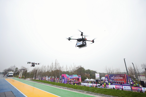 賽中,團隊采用無人機“空地協(xié)同”保障方案,提供空中巡查、應急救援、醫(yī)療運輸?shù)饶芰Γ哼\用無人運輸機進行醫(yī)療藥品運轉(zhuǎn)流程,并進行AED等醫(yī)療物資投放;在賽事后段設置無人機懸停點對賽事人員安全進行保障,協(xié)助構建起多維度、立體化、全時空的賽事安全保障服務體系。