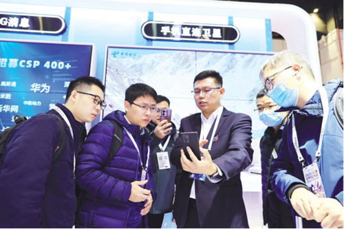 在“5G新通信”展區(qū),觀展者駐足體驗(yàn)中國(guó)電信自研手機(jī)的衛(wèi)星通信功能。2023年9月,中國(guó)電信推出手機(jī)直連衛(wèi)星業(yè)務(wù),成為全球首家實(shí)現(xiàn)地面蜂窩網(wǎng)與衛(wèi)星網(wǎng)融合的電信運(yùn)營(yíng)商,用戶在偏遠(yuǎn)戶外、森林、沙漠、高山、海洋等移動(dòng)網(wǎng)絡(luò)覆蓋不到的地方,或遭遇洪水、地震等自然災(zāi)害,手機(jī)直連衛(wèi)星業(yè)務(wù)將成為應(yīng)急通信最主要的手段。