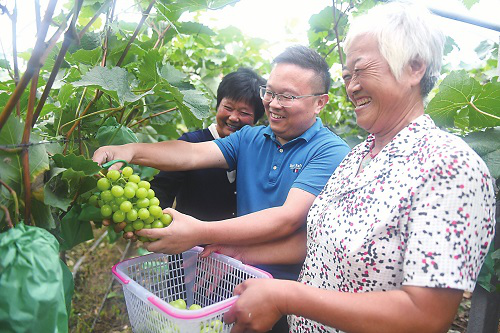 9月10日,江蘇省淮安市漣水縣梁岔鎮(zhèn)費(fèi)莊村百畝葡萄園的陽(yáng)光玫瑰葡萄熟了。駐村第一書記、中國(guó)電信江蘇公司扶貧隊(duì)隊(duì)員周臘成(右二)幫助種植戶采摘新鮮的葡萄并打包裝箱發(fā)貨。近年來(lái),中國(guó)電信江蘇公司精準(zhǔn)幫扶費(fèi)莊村,持續(xù)擴(kuò)大葡萄園規(guī)模,通過智慧農(nóng)業(yè)試點(diǎn)推進(jìn),為村民種植戶優(yōu)質(zhì)增產(chǎn)提供技術(shù)保障。